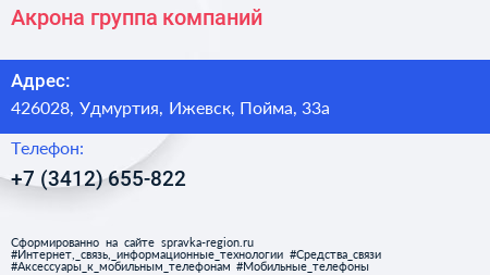Акрона, группа компаний по адресу 426028, Удмуртия, Ижевск, Пойма, 33а в дальнейшем Организация, размещена в следующих категориях: