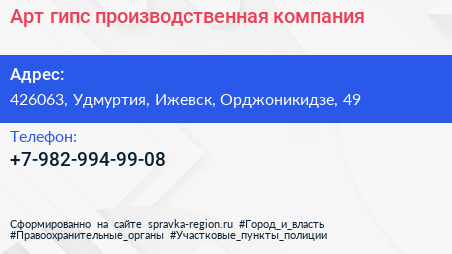 Арт-гипс, производственная компания по адресу 426063, Удмуртия, Ижевск, Орджоникидзе, 49 в дальнейшем Организация, размещена в следующих категориях: