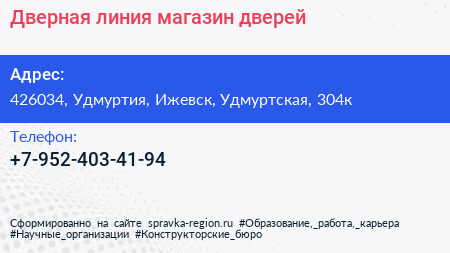 Дверная линия, магазин дверей по адресу 426034, Удмуртия, Ижевск, Удмуртская, 304к в дальнейшем Организация, размещена в следующих категориях: