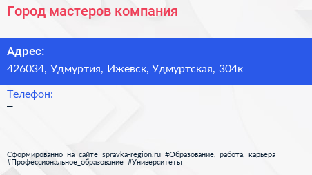 Город мастеров, компания по адресу 426034, Удмуртия, Ижевск, Удмуртская, 304к в дальнейшем Организация, размещена в следующих категориях: