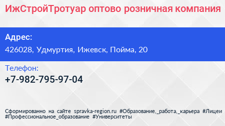 ИжСтройТротуар, оптово-розничная компания по адресу 426028, Удмуртия, Ижевск, Пойма, 20 в дальнейшем Организация, размещена в следующих категориях:
