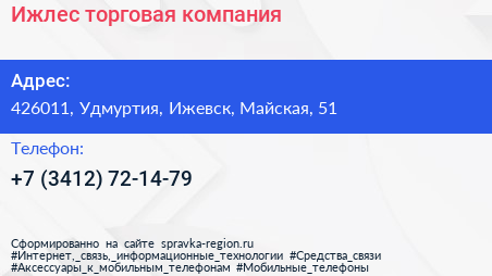 Ижлес, торговая компания по адресу 426011, Удмуртия, Ижевск, Майская, 51 в дальнейшем Организация, размещена в следующих категориях:
