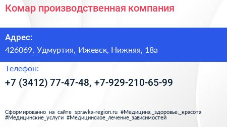 Для связи с организацией воспользуйтесь номером телефона: +7 (3412) 77-47-48, +7-929-210-65-99. Пн: c 09:00-18:00, Вт: c 09:00-18:00, Ср: c 09:00-18:00, Чт: c 09:00-18:00, Пт: c 09:00-18:00, Сб: выходной, Вс: выходной, вы можете обратиться в эту организацию.