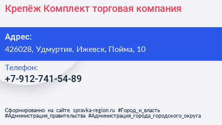 Крепёж Комплект, торговая компания по адресу 426028, Удмуртия, Ижевск, Пойма, 10 в дальнейшем Организация, размещена в следующих категориях:
