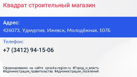 Квадрат, строительный магазин по адресу 426073, Удмуртия, Ижевск, Молодёжная, 107Б в дальнейшем Организация, размещена в следующих категориях:
