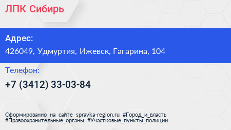 ЛПК Сибирь по адресу 426049, Удмуртия, Ижевск, Гагарина, 104 в дальнейшем Организация, размещена в следующих категориях:
