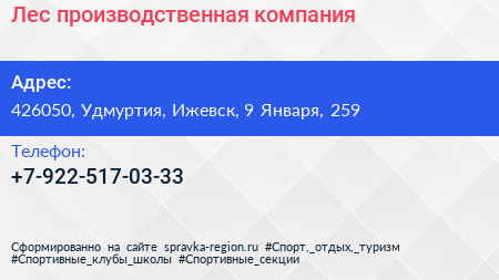 Лес, производственная компания по адресу 426050, Удмуртия, Ижевск, 9 Января, 259 в дальнейшем Организация, размещена в следующих категориях: