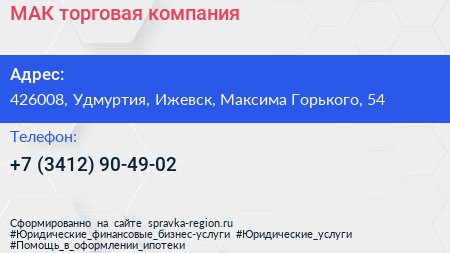 МАК, торговая компания по адресу 426008, Удмуртия, Ижевск, Максима Горького, 54 в дальнейшем Организация, размещена в следующих категориях: