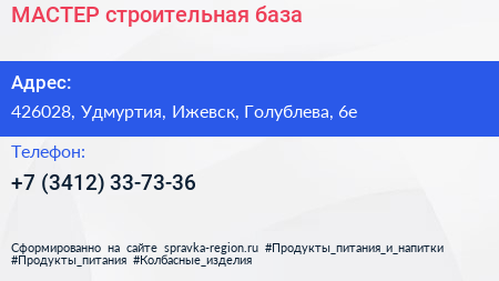 МАСТЕР, строительная база по адресу 426028, Удмуртия, Ижевск, Голублева, 6е в дальнейшем Организация, размещена в следующих категориях:
