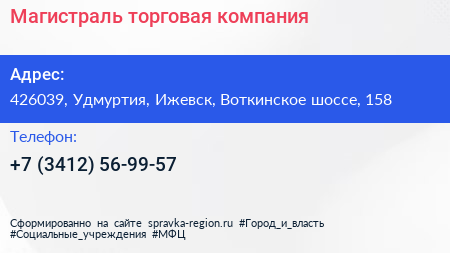 Магистраль, торговая компания по адресу 426039, Удмуртия, Ижевск, Воткинское шоссе, 158 в дальнейшем Организация, размещена в следующих категориях:
