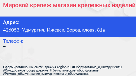 Мировой крепеж, магазин крепежных изделий по адресу 426053, Удмуртия, Ижевск, Ворошилова, 81а в дальнейшем Организация, размещена в следующих категориях: