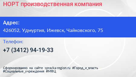 НОРТ, производственная компания по адресу 426052, Удмуртия, Ижевск, Чайковского, 75 в дальнейшем Организация, размещена в следующих категориях: