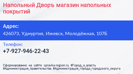 Напольный Дворъ, магазин напольных покрытий по адресу 426073, Удмуртия, Ижевск, Молодёжная, 107Б в дальнейшем Организация, размещена в следующих категориях:
