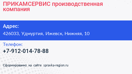 ПРИКАМСЕРВИС, производственная компания по адресу 426033, Удмуртия, Ижевск, Нижняя, 10 в дальнейшем Организация, размещена в следующих категориях: