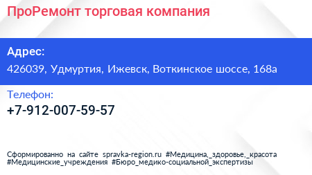 ПроРемонт, торговая компания по адресу 426039, Удмуртия, Ижевск, Воткинское шоссе, 168а в дальнейшем Организация, размещена в следующих категориях: