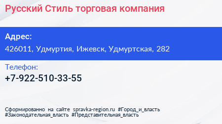 Русский Стиль, торговая компания по адресу 426011, Удмуртия, Ижевск, Удмуртская, 282 в дальнейшем Организация, размещена в следующих категориях: