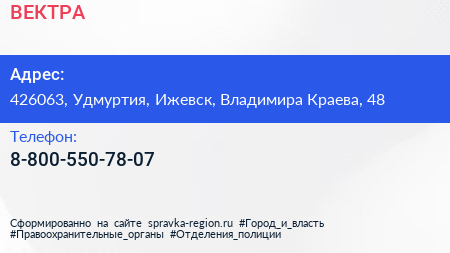 ВЕКТРА по адресу 426063, Удмуртия, Ижевск, Владимира Краева, 48 в дальнейшем Организация, размещена в следующих категориях: