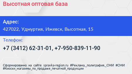 Высотная, оптовая база по адресу 427022, Удмуртия, Ижевск, Высотная, 15 в дальнейшем Организация, размещена в следующих категориях: