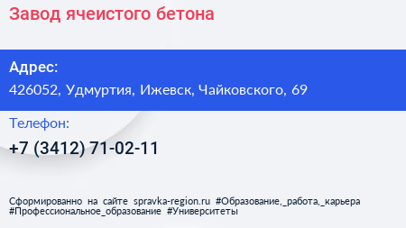 Завод ячеистого бетона по адресу 426052, Удмуртия, Ижевск, Чайковского, 69 в дальнейшем Организация, размещена в следующих категориях: