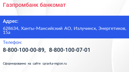 Газпромбанк, банкомат по адресу 628634, Ханты-Мансийский АО, Излучинск, Энергетиков, 15а в дальнейшем Организация, размещена в следующих категориях: