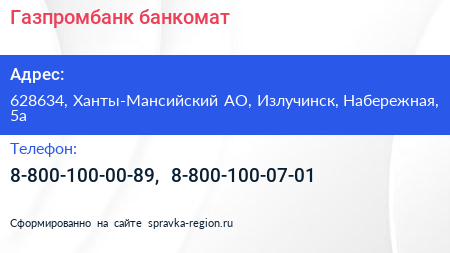Газпромбанк, банкомат по адресу 628634, Ханты-Мансийский АО, Излучинск, Набережная, 5а в дальнейшем Организация, размещена в следующих категориях: