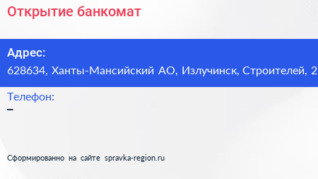 Открытие, банкомат по адресу 628634, Ханты-Мансийский АО, Излучинск, Строителей, 2 в дальнейшем Организация, размещена в следующих категориях: