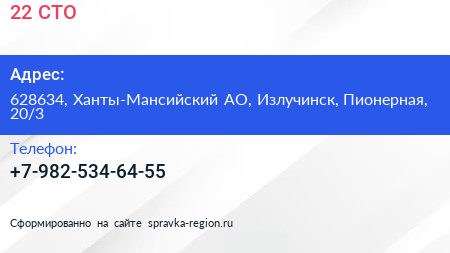 22, СТО по адресу 628634, Ханты-Мансийский АО, Излучинск, Пионерная, 20/3 в дальнейшем Организация, размещена в следующих категориях: