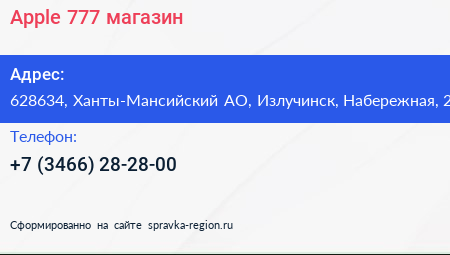 Apple 777, магазин по адресу 628634, Ханты-Мансийский АО, Излучинск, Набережная, 2 в дальнейшем Организация, размещена в следующих категориях: