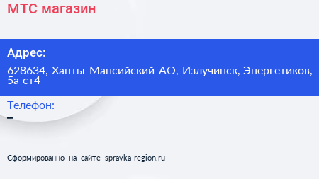 МТС, магазин по адресу 628634, Ханты-Мансийский АО, Излучинск, Энергетиков, 5а ст4 в дальнейшем Организация, размещена в следующих категориях: