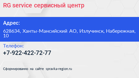 RG service, сервисный центр по адресу 628634, Ханты-Мансийский АО, Излучинск, Набережная, 10 в дальнейшем Организация, размещена в следующих категориях: