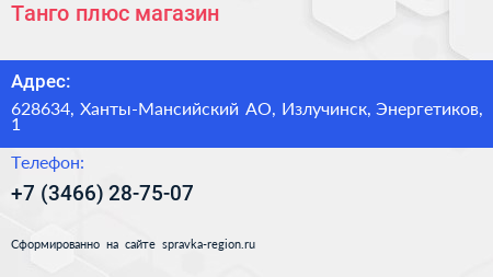 Танго плюс, магазин по адресу 628634, Ханты-Мансийский АО, Излучинск, Энергетиков, 1 в дальнейшем Организация, размещена в следующих категориях: