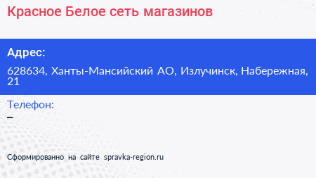 Красное & Белое, сеть магазинов по адресу 628634, Ханты-Мансийский АО, Излучинск, Набережная, 21 в дальнейшем Организация, размещена в следующих категориях: