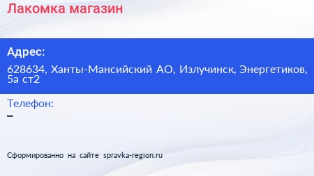 Лакомка, магазин по адресу 628634, Ханты-Мансийский АО, Излучинск, Энергетиков, 5а ст2 в дальнейшем Организация, размещена в следующих категориях: