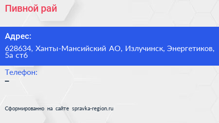 Пивной рай по адресу 628634, Ханты-Мансийский АО, Излучинск, Энергетиков, 5а ст6 в дальнейшем Организация, размещена в следующих категориях:
