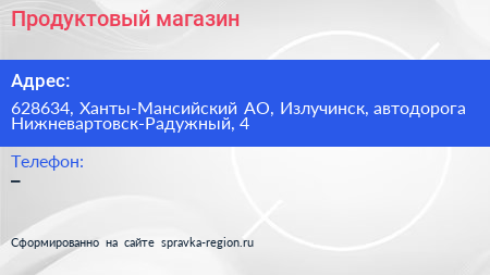 Продуктовый магазин по адресу 628634, Ханты-Мансийский АО, Излучинск, автодорога Нижневартовск-Радужный, 4 в дальнейшем Организация, размещена в следующих категориях: