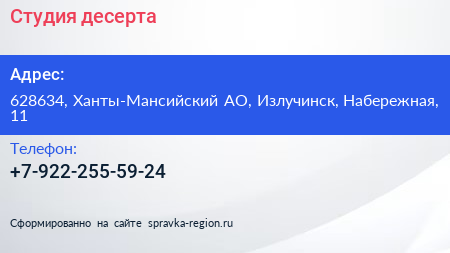 Студия десерта по адресу 628634, Ханты-Мансийский АО, Излучинск, Набережная, 11 в дальнейшем Организация, размещена в следующих категориях: