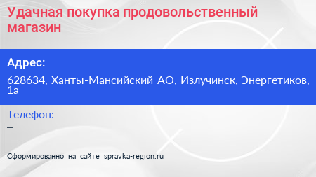 Удачная покупка, продовольственный магазин по адресу 628634, Ханты-Мансийский АО, Излучинск, Энергетиков, 1а в дальнейшем Организация, размещена в следующих категориях: