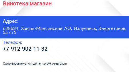 Винотека, магазин по адресу 628634, Ханты-Мансийский АО, Излучинск, Энергетиков, 5а ст5 в дальнейшем Организация, размещена в следующих категориях: