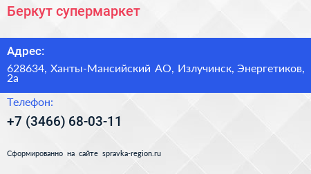 Беркут, супермаркет по адресу 628634, Ханты-Мансийский АО, Излучинск, Энергетиков, 2а в дальнейшем Организация, размещена в следующих категориях: