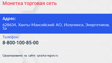 Монетка, торговая сеть по адресу 628634, Ханты-Мансийский АО, Излучинск, Энергетиков, 5а в дальнейшем Организация, размещена в следующих категориях: