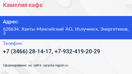 Камелия, кафе по адресу 628634, Ханты-Мансийский АО, Излучинск, Энергетиков, 3 в дальнейшем Организация, размещена в следующих категориях: