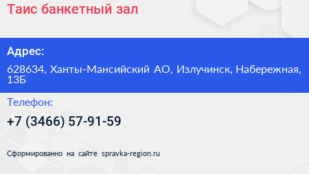 Таис, банкетный зал по адресу 628634, Ханты-Мансийский АО, Излучинск, Набережная, 13Б в дальнейшем Организация, размещена в следующих категориях: