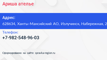 Ариша, ателье по адресу 628634, Ханты-Мансийский АО, Излучинск, Набережная, 2 в дальнейшем Организация, размещена в следующих категориях: