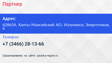Партнер по адресу 628634, Ханты-Мансийский АО, Излучинск, Энергетиков, 6 в дальнейшем Организация, размещена в следующих категориях: