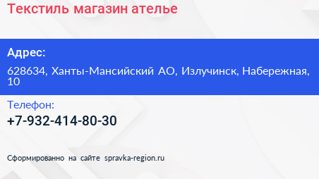 Текстиль, магазин-ателье по адресу 628634, Ханты-Мансийский АО, Излучинск, Набережная, 10 в дальнейшем Организация, размещена в следующих категориях: