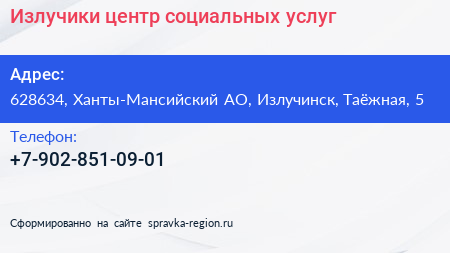 Излучики, центр социальных услуг по адресу 628634, Ханты-Мансийский АО, Излучинск, Таёжная, 5 в дальнейшем Организация, размещена в следующих категориях: