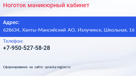 Ноготок, маникюрный кабинет по адресу 628634, Ханты-Мансийский АО, Излучинск, Школьная, 16 в дальнейшем Организация, размещена в следующих категориях: