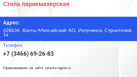 Стиль, парикмахерская по адресу 628634, Ханты-Мансийский АО, Излучинск, Строителей, 1а в дальнейшем Организация, размещена в следующих категориях: