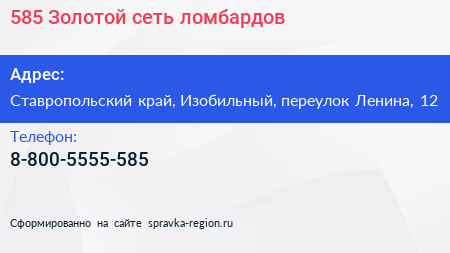 585*Золотой, сеть ломбардов по адресу Ставропольский край, Изобильный, переулок Ленина, 12 в дальнейшем Организация, размещена в следующих категориях: