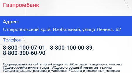 Газпромбанк по адресу Ставропольский край, Изобильный, улица Ленина, 62 в дальнейшем Организация, размещена в следующих категориях: